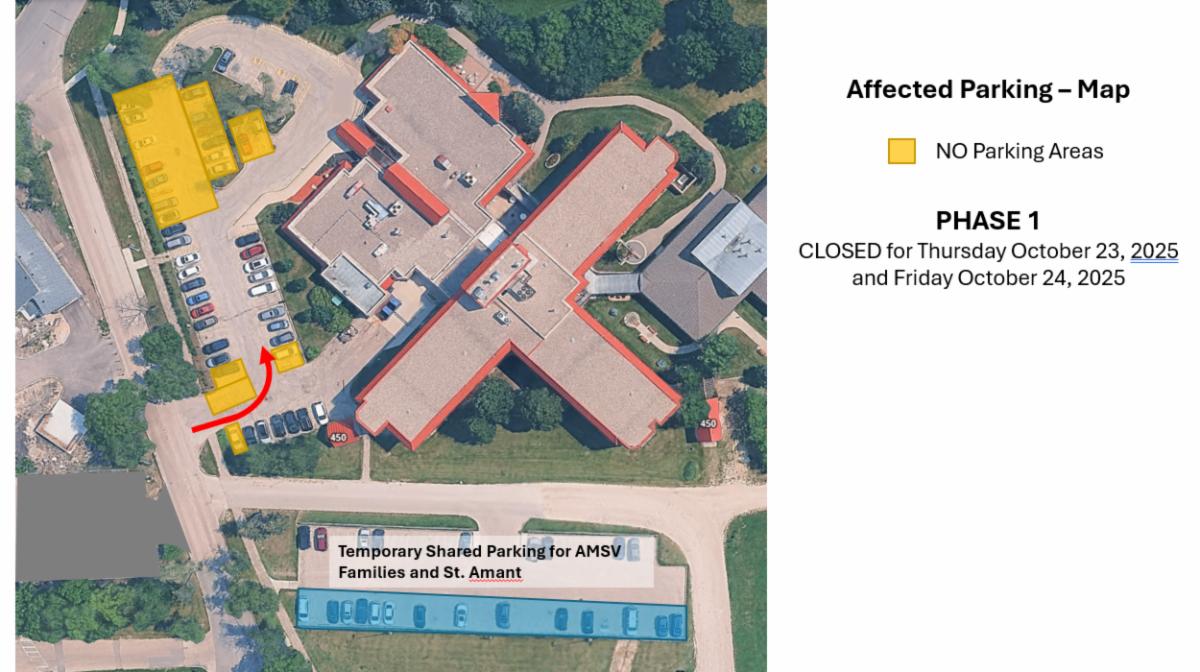 Nous vous écrivons pour vous informer que des travaux d’entretien de l’asphalte dans le terrain de stationnement sont prévus chez Actionmarguerite Saint-Vital. Ces travaux se dérouleront en deux phases, la première ayant lieu du 23 au 24 octobre. Pendant cette période, plusieurs espaces de stationnement seront temporairement inaccessibles, comme indiqué dans l’image ci-dessous.